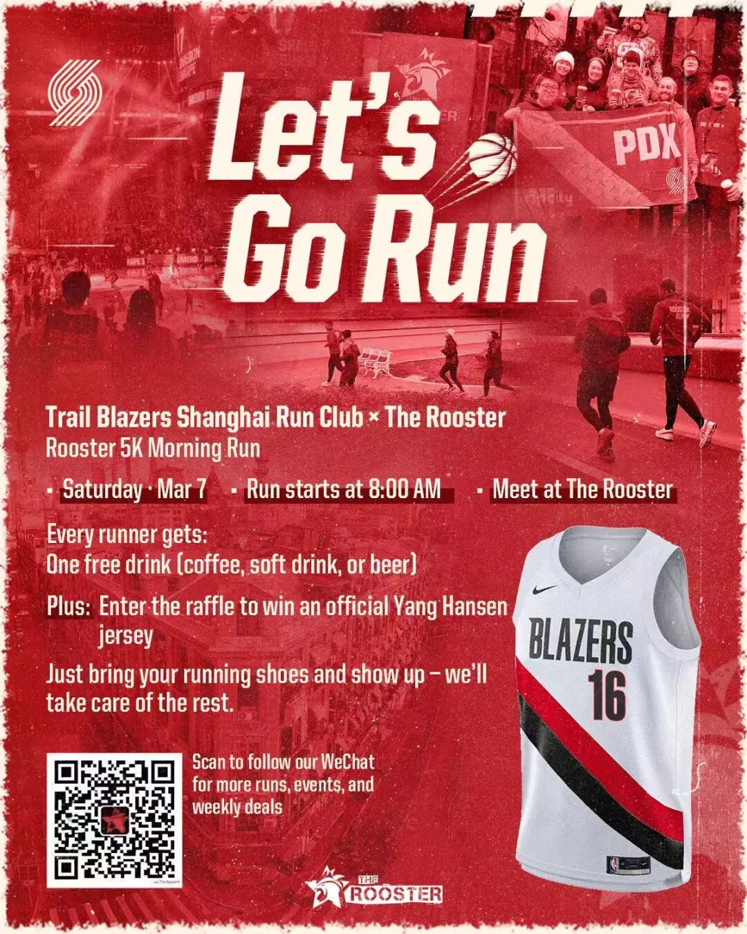 Runners meet at The Rooster, hit the pavement, and earn their reward—every participant gets one free drink, be it coffee, soda, or beer—and a shot at winning an official Yang Hansen jersey in the raffle.